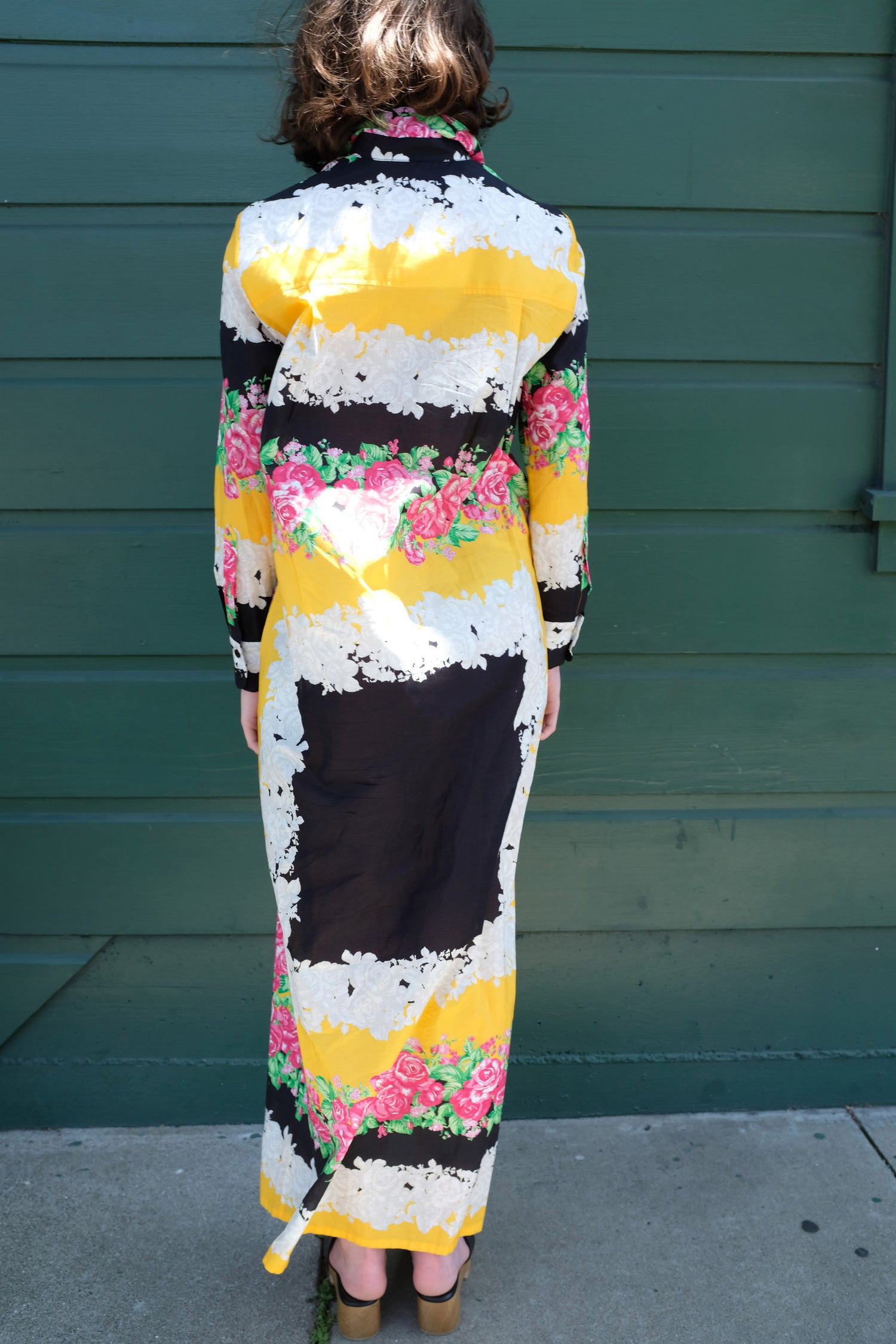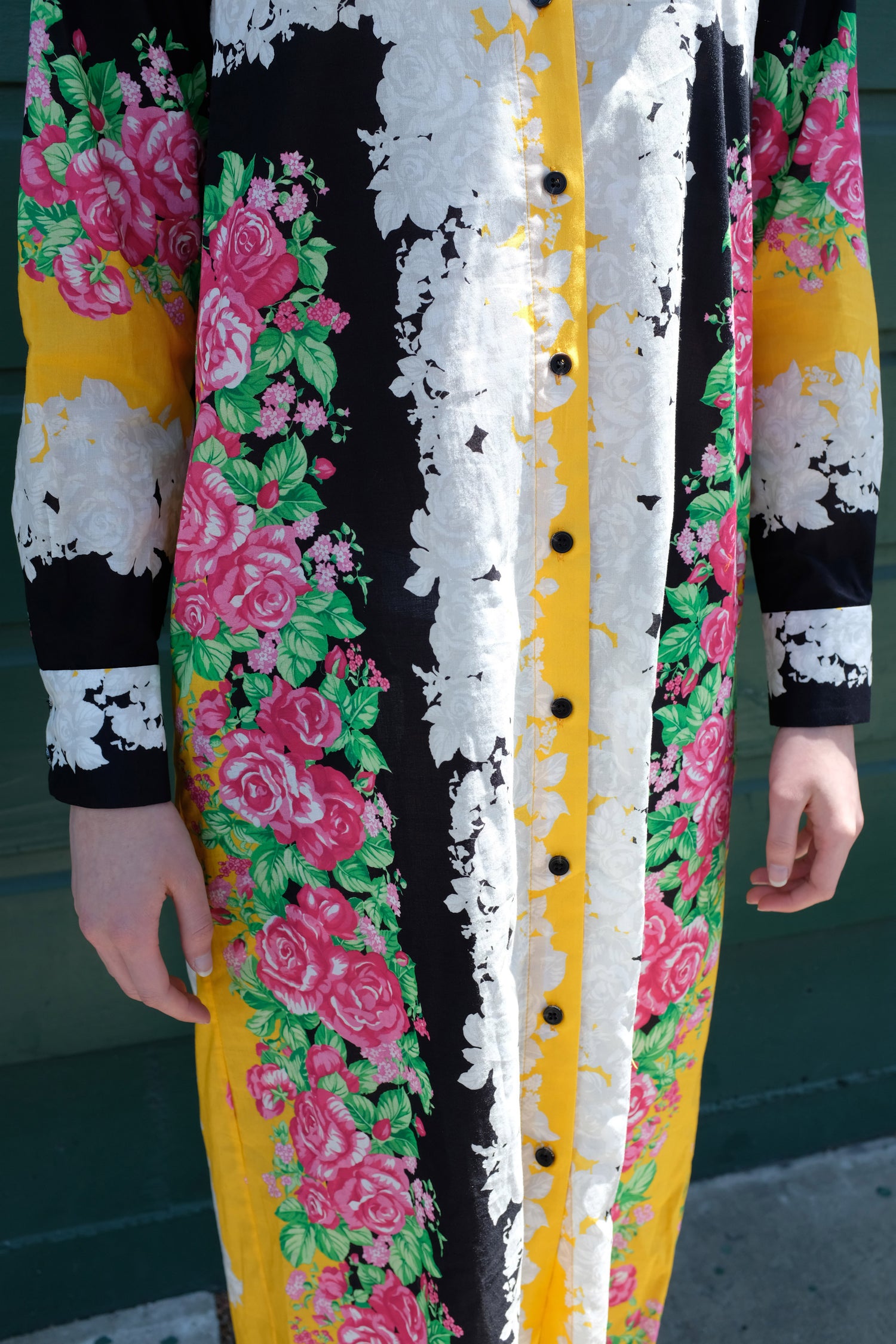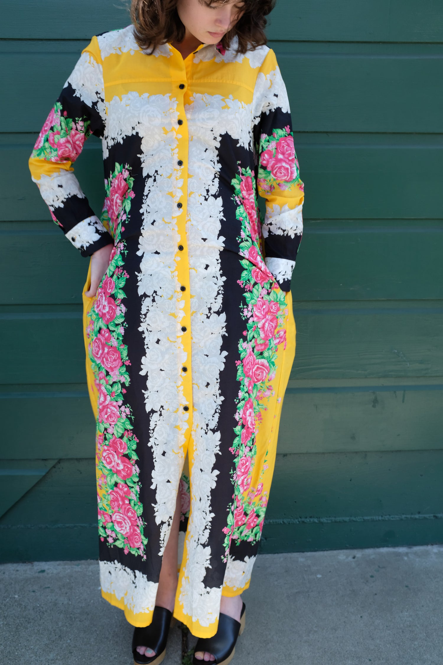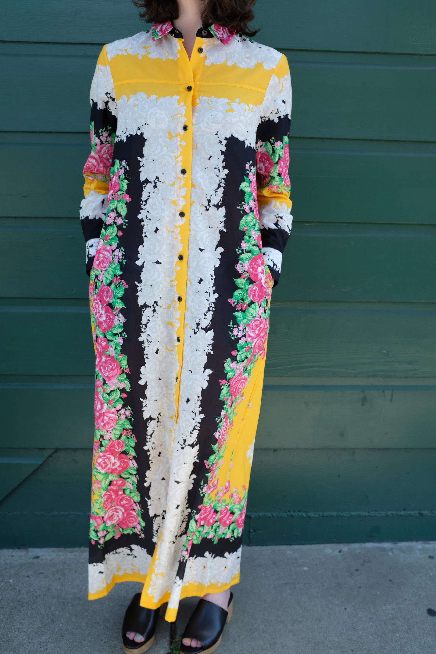 Long sleeve maxi dress in Yellow Foulard floral print, double button cuff, pointed collar, side pockets, button placket closure down front. Unlined and breezy printed foulard cotton voile, smooth and durable fabric with a clean, fresh hand feel. 100% Italian Cotton. Not sheer.