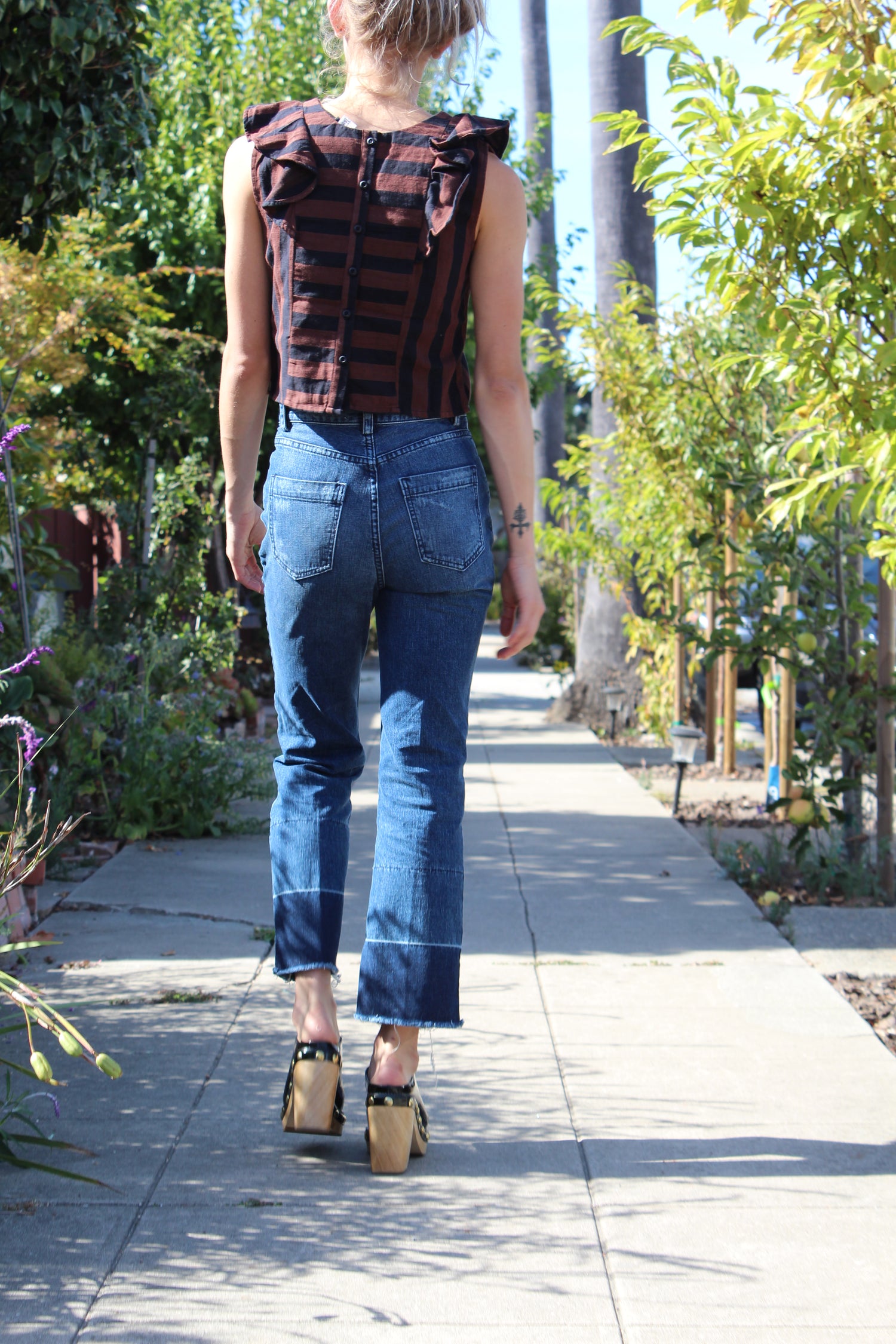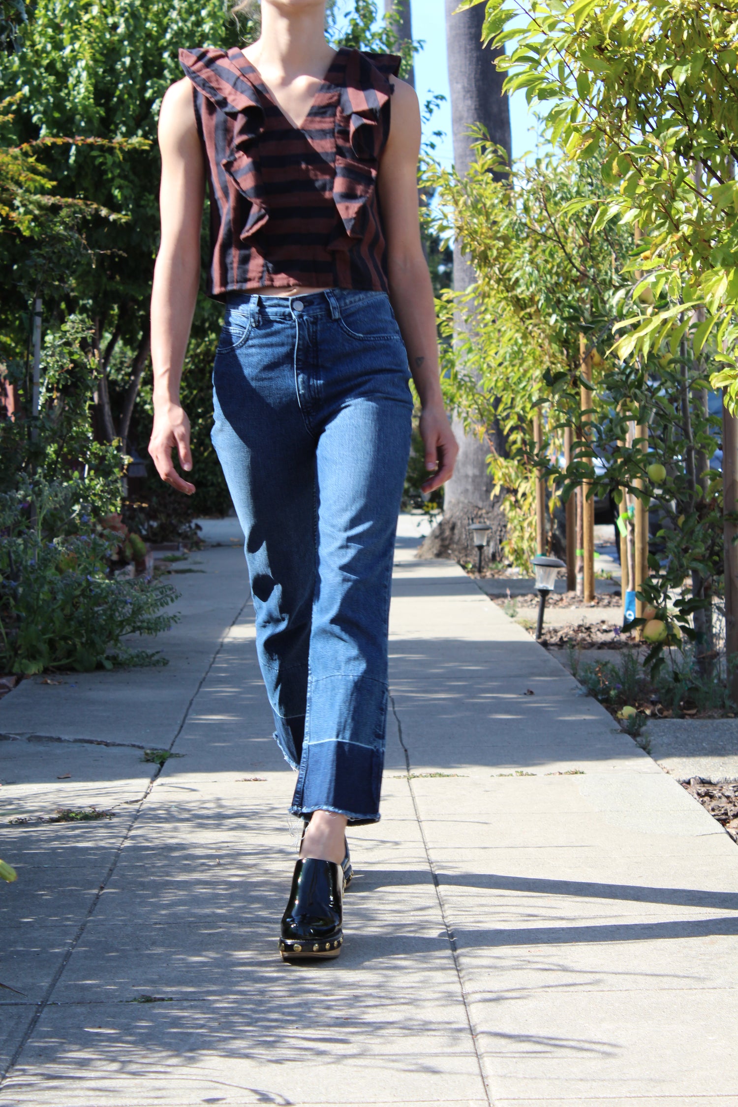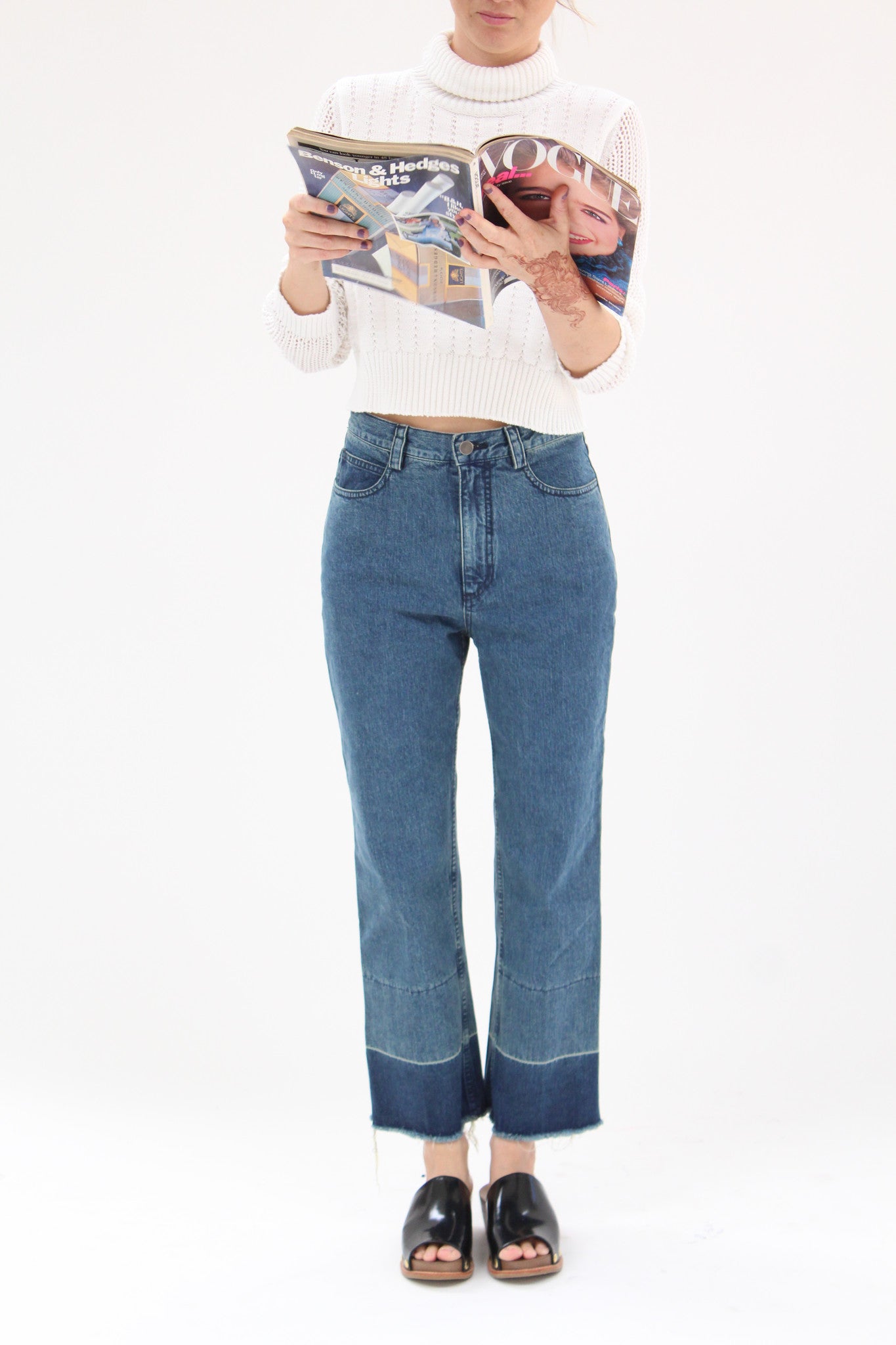 Mid-rise straight leg pant in indigo denim. Raw, distressed hem, curved pockets at the front, patch pockets at the back. Concealed zip up fly with button closure. Relaxed fit. 100% cotton.