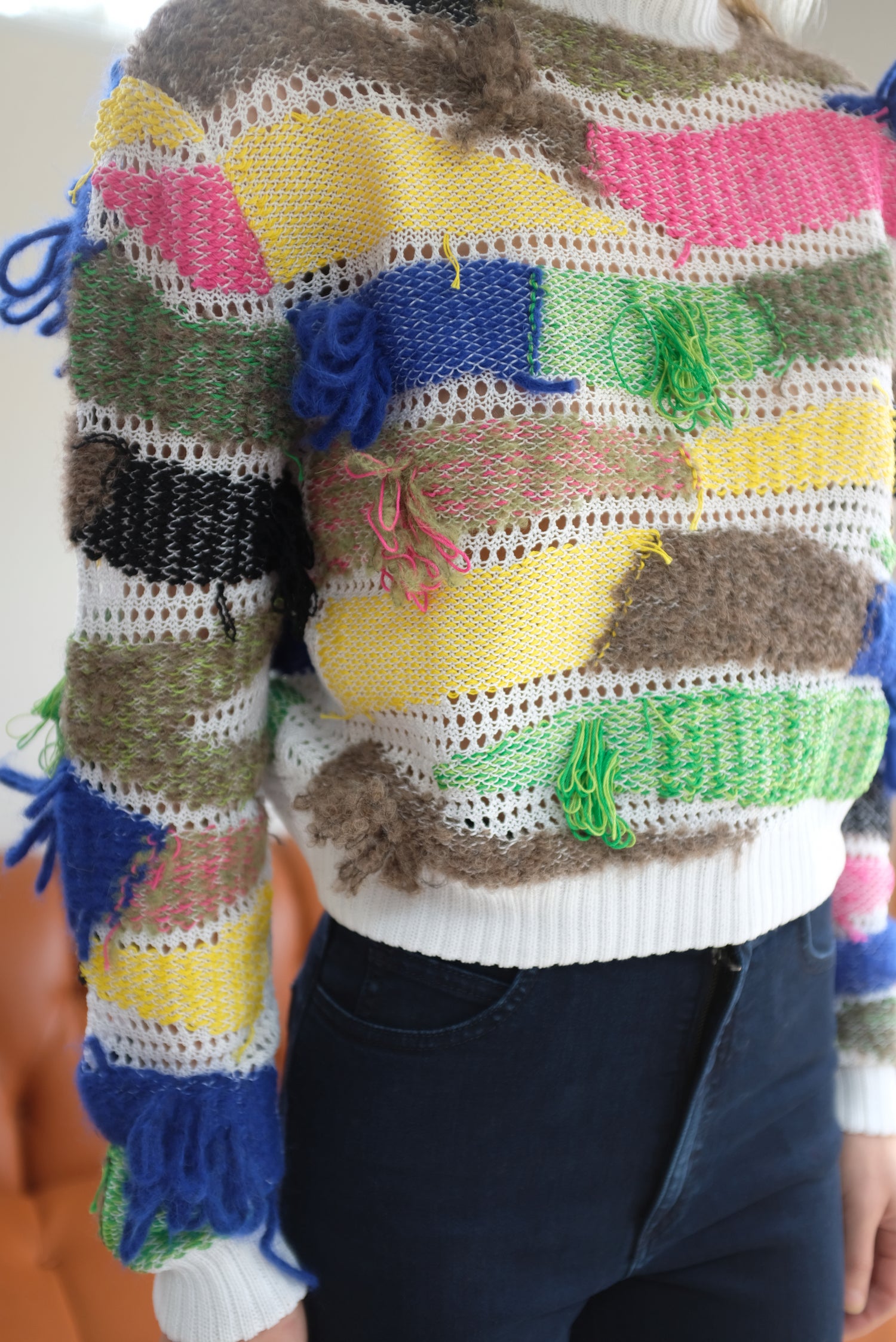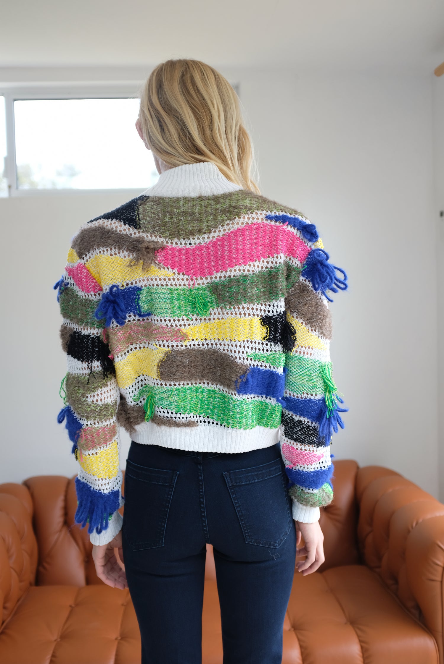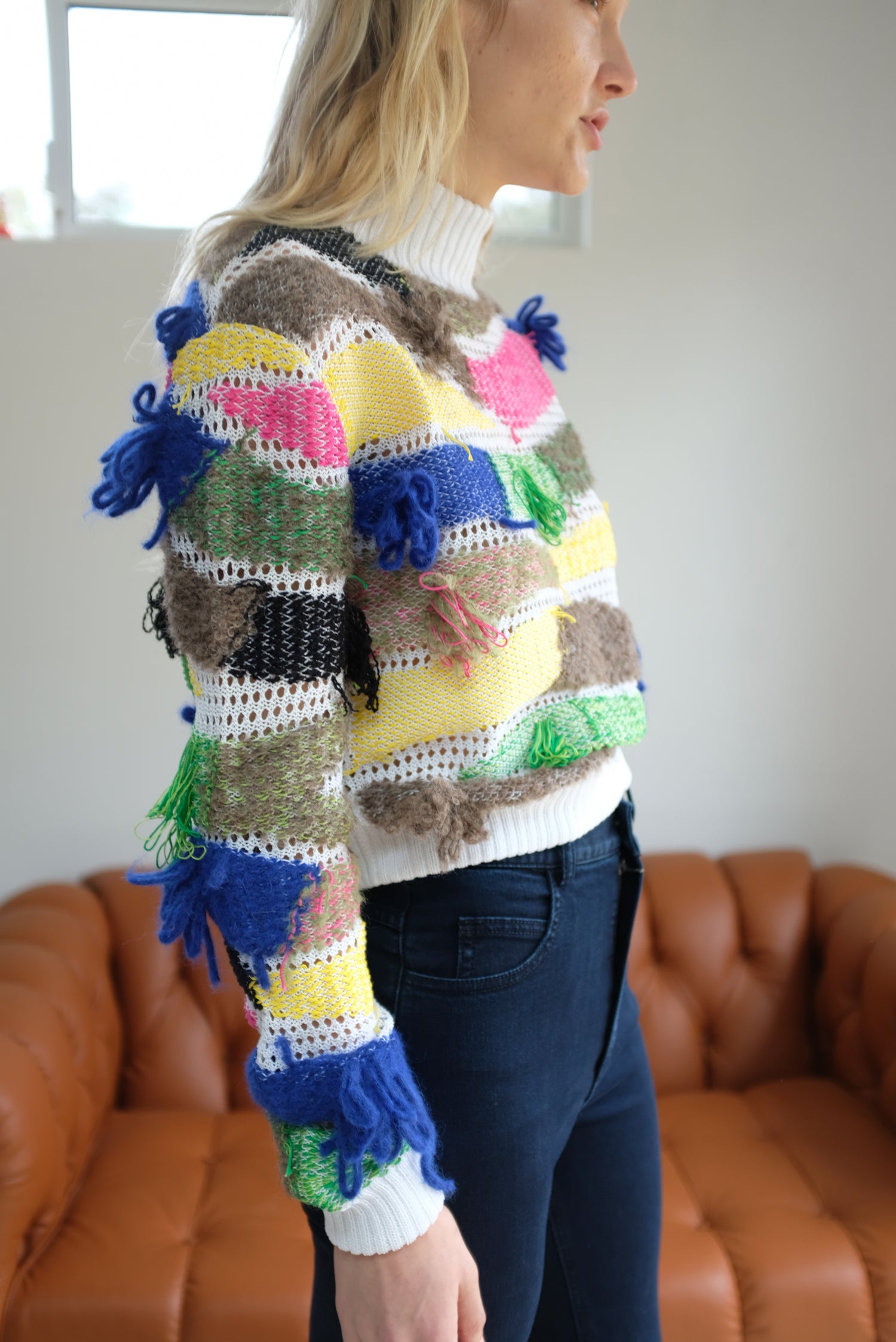 Chunky pullover sweater in combo knit with ribbed mockneck. Super comfortable and cozy! Knit lace base with contrasting yarns woven through in horizontal sweeps, looped fringe details poke through. Knit ribbing at cuffs and body hem.