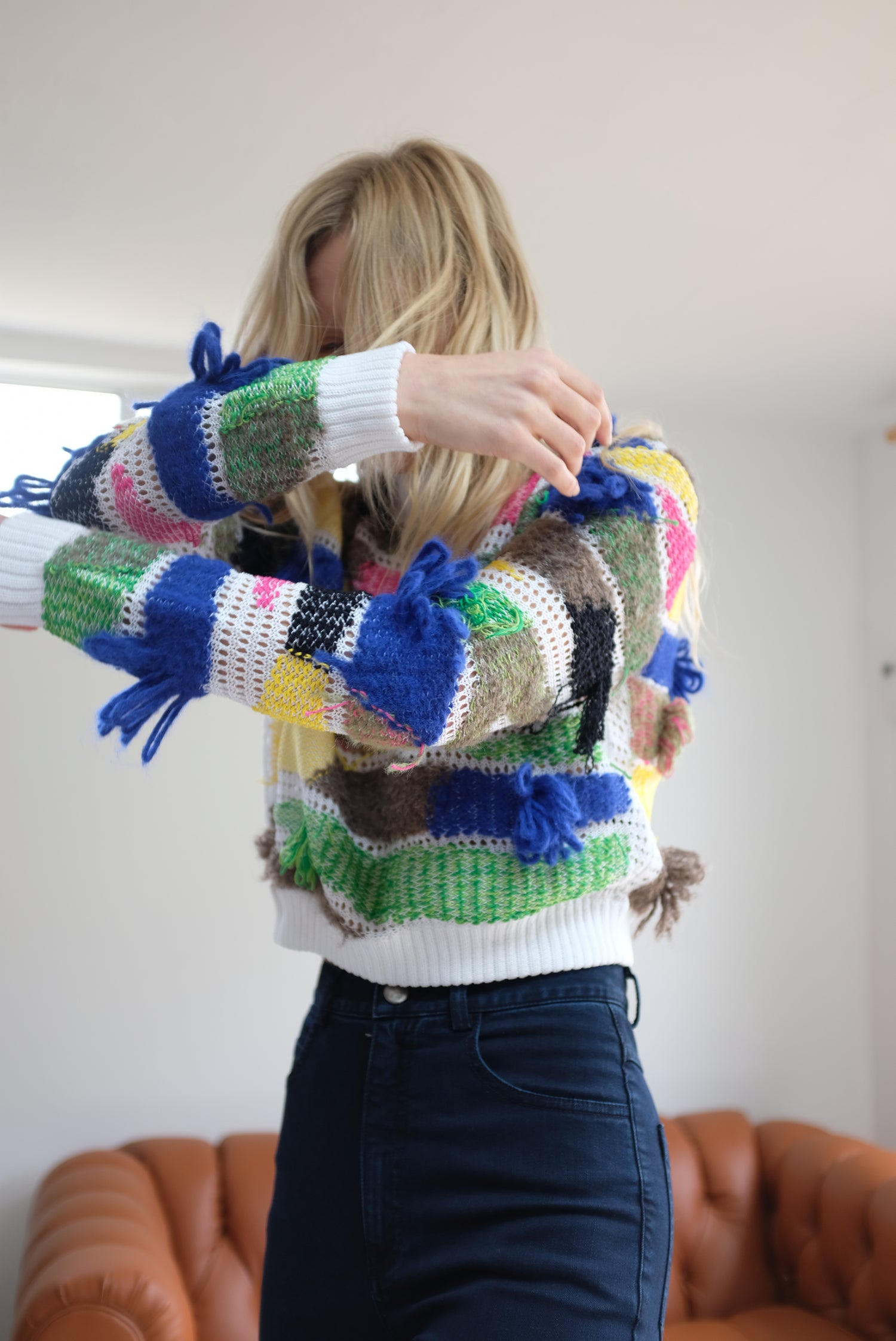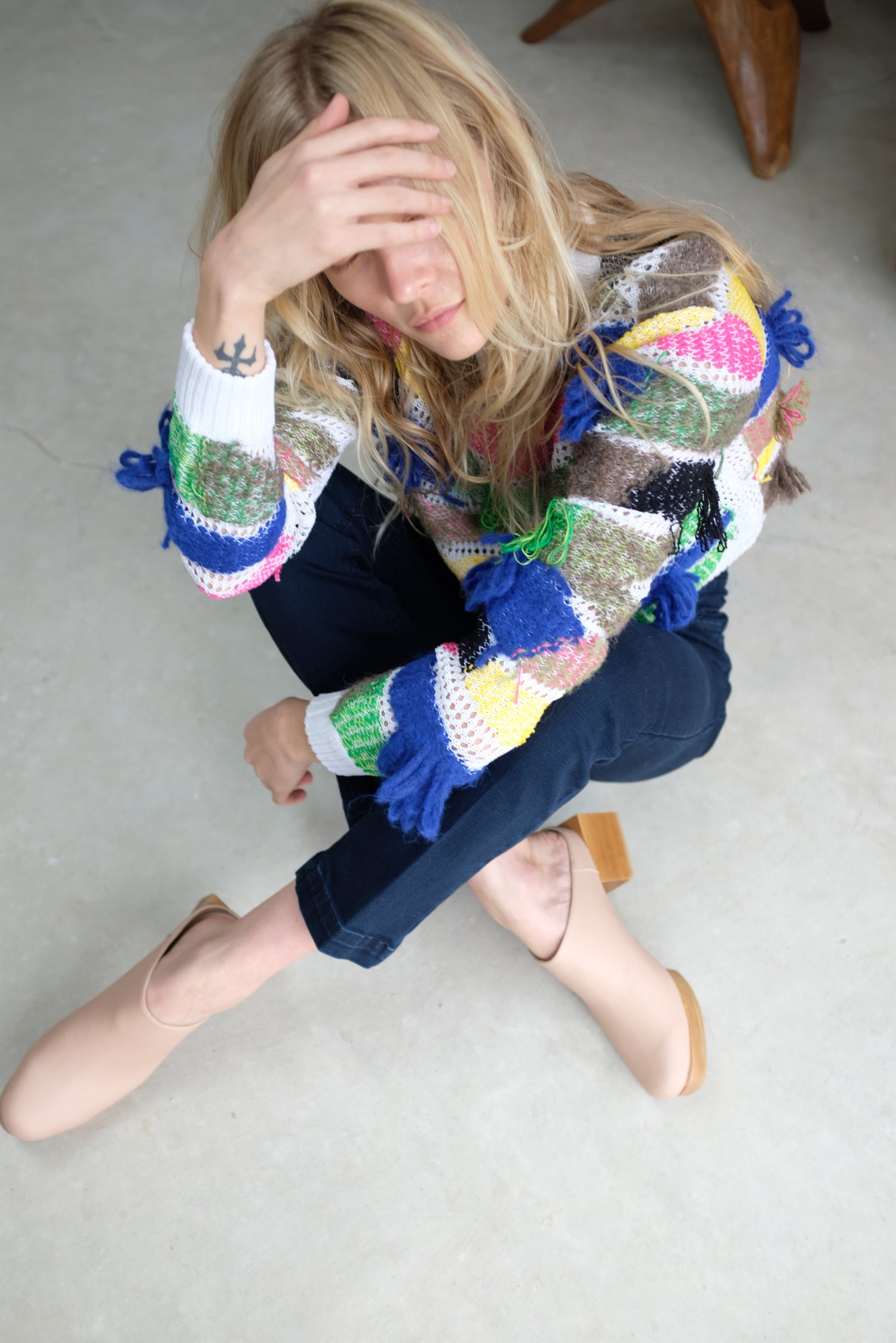 Limited edition sweater produced with a small company in Peru that specializes in repurposing 'liability' or leftover organic yarns. 95% Cotton, 4% Aplaca, 1% Wool, 1% Polyamide.