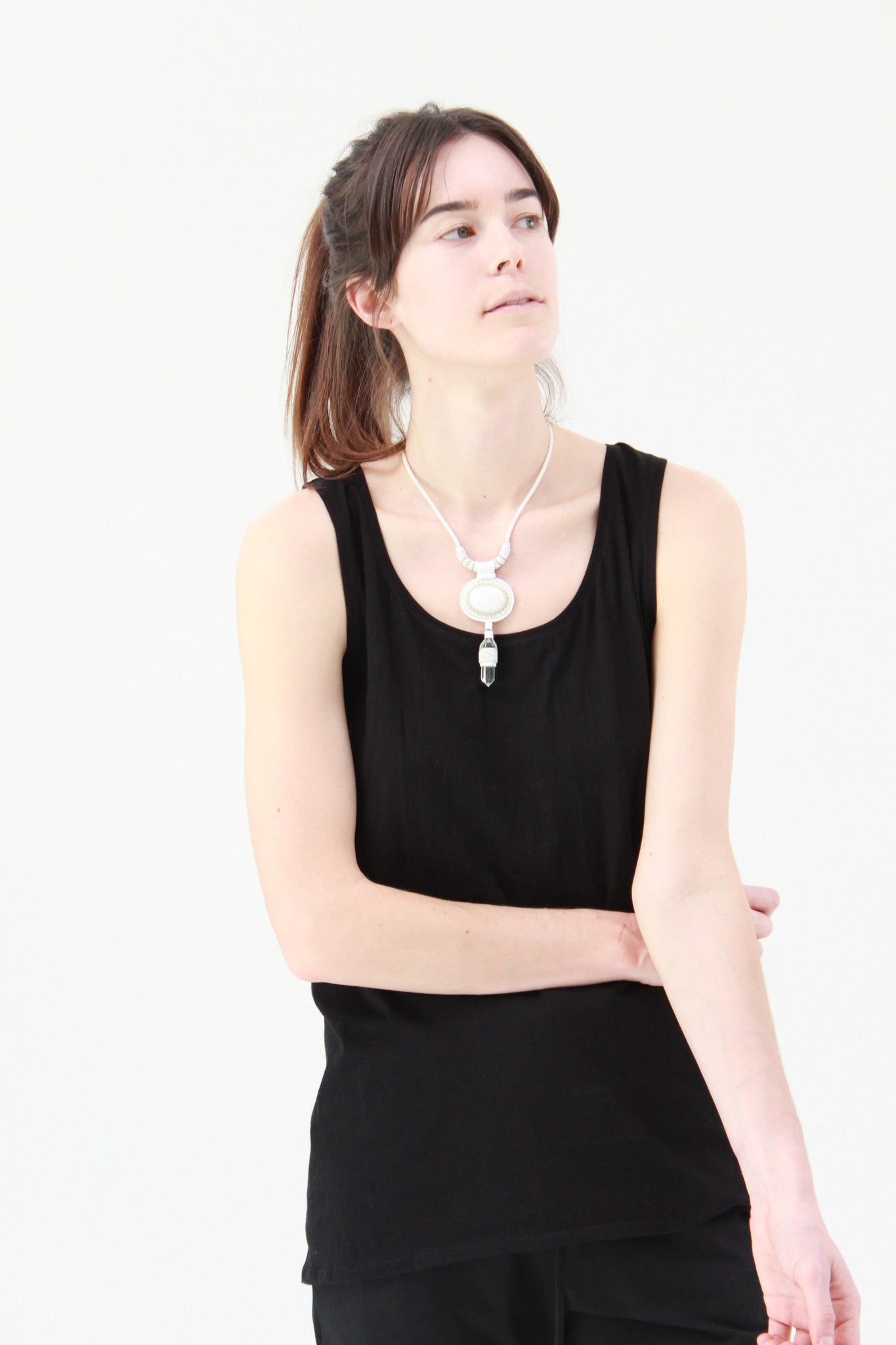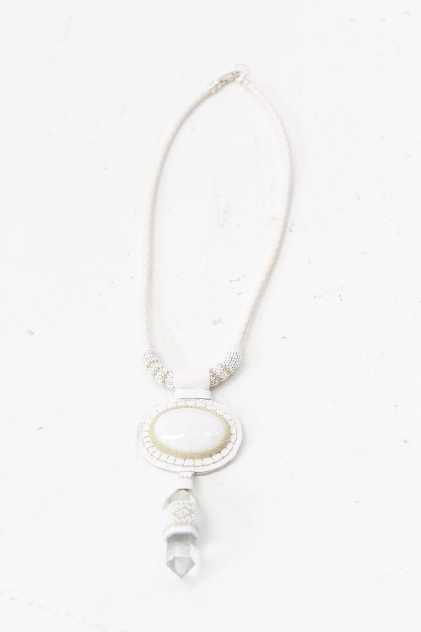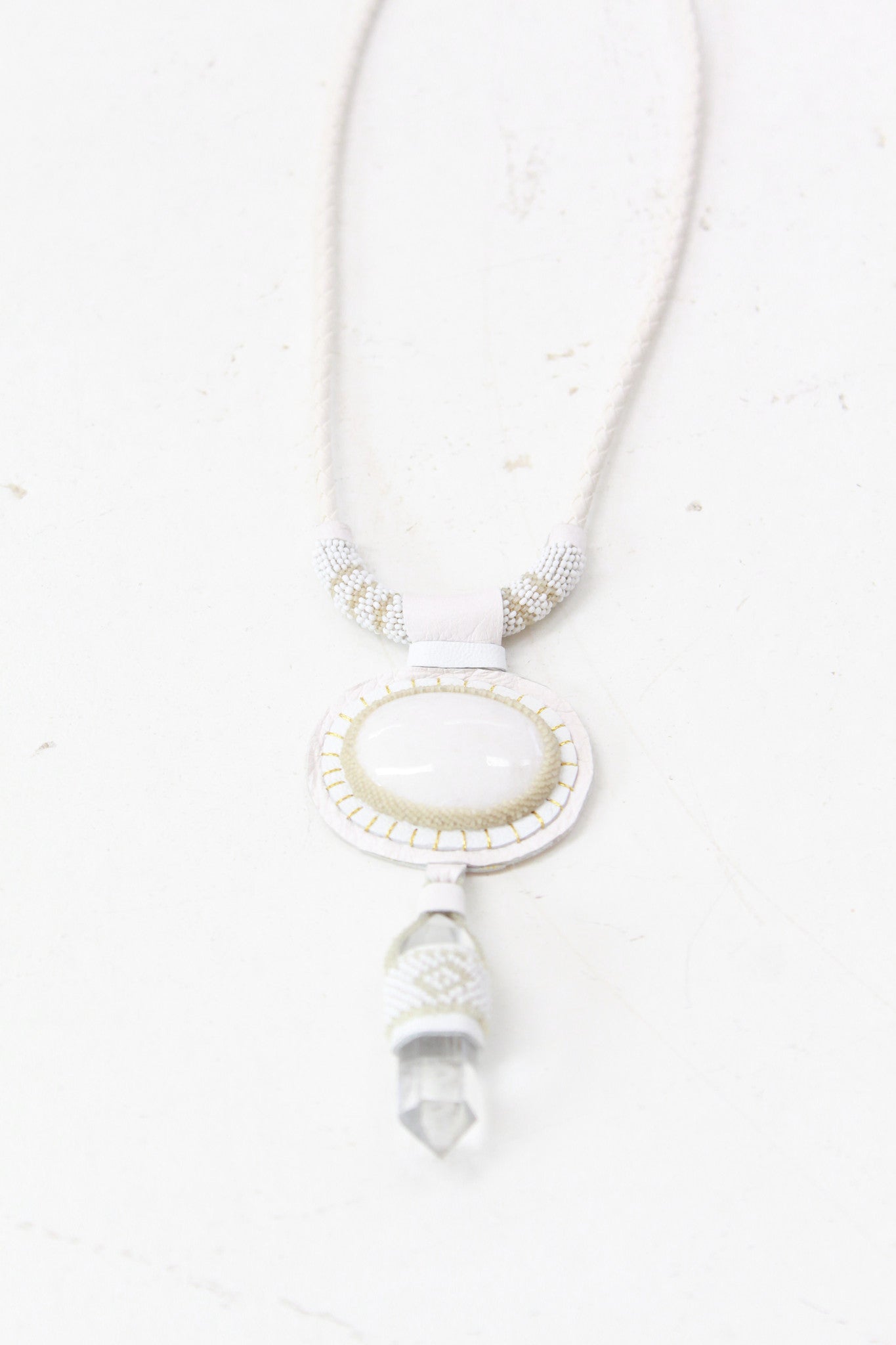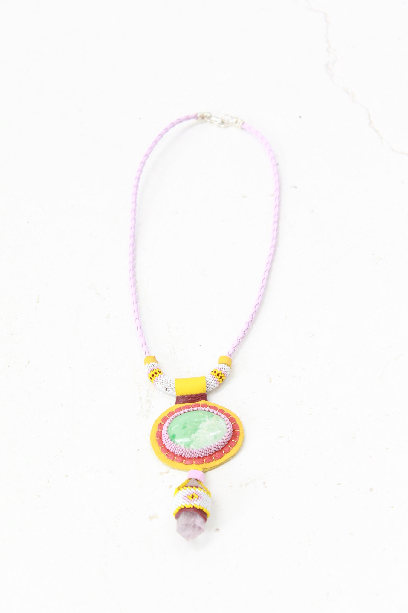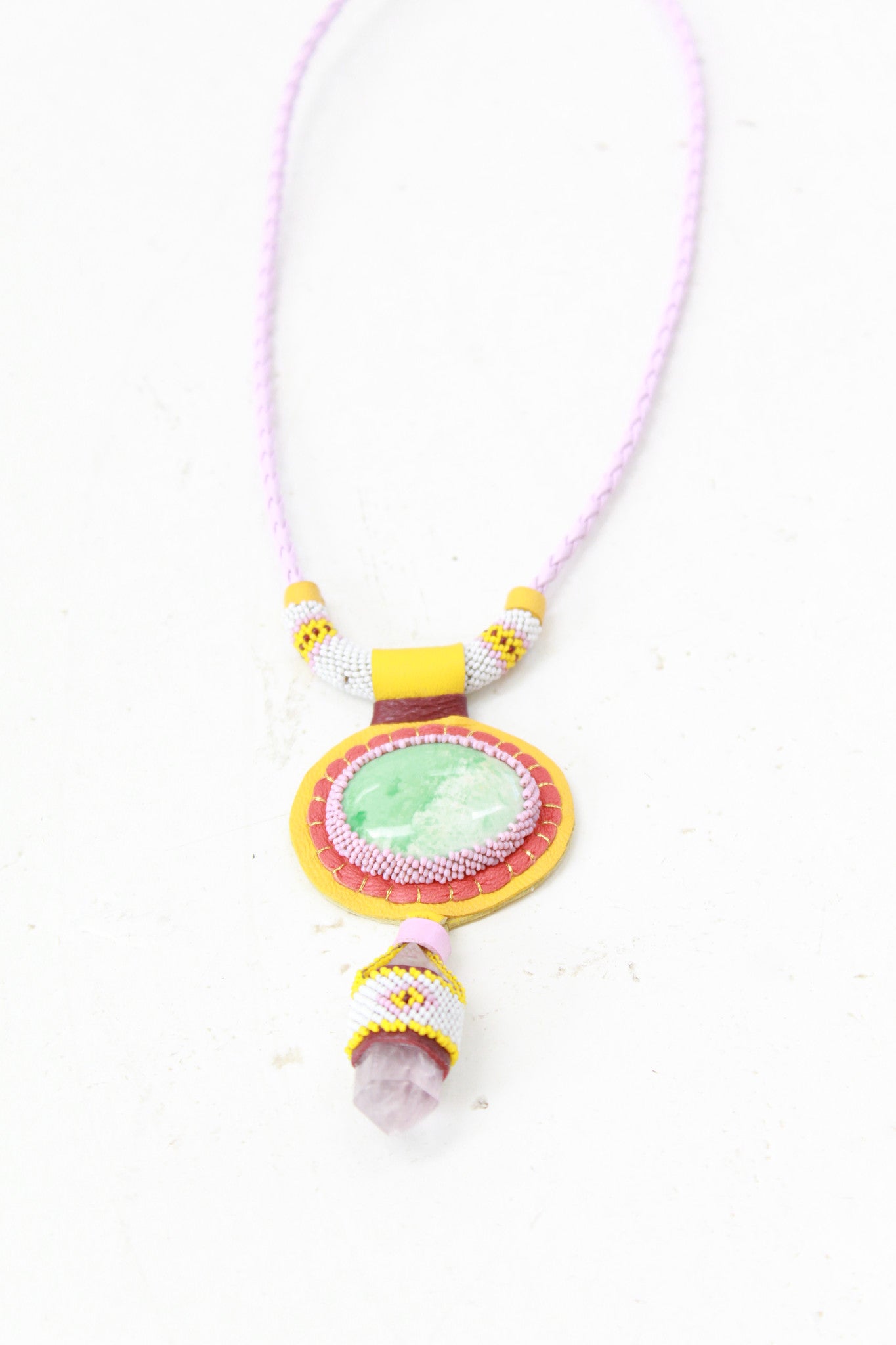 Semi precious stones, hand beaded pendant, leather backing, available in 3 different colors, pink, blue and nut. 17" Gold filled thread and clasp.